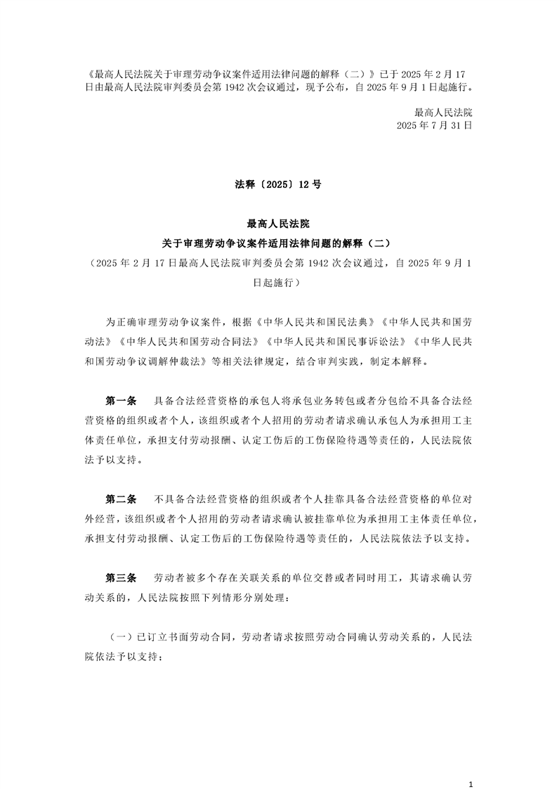 最高人民法院關(guān)于審理勞動爭議案件適用法律問題的解釋二
